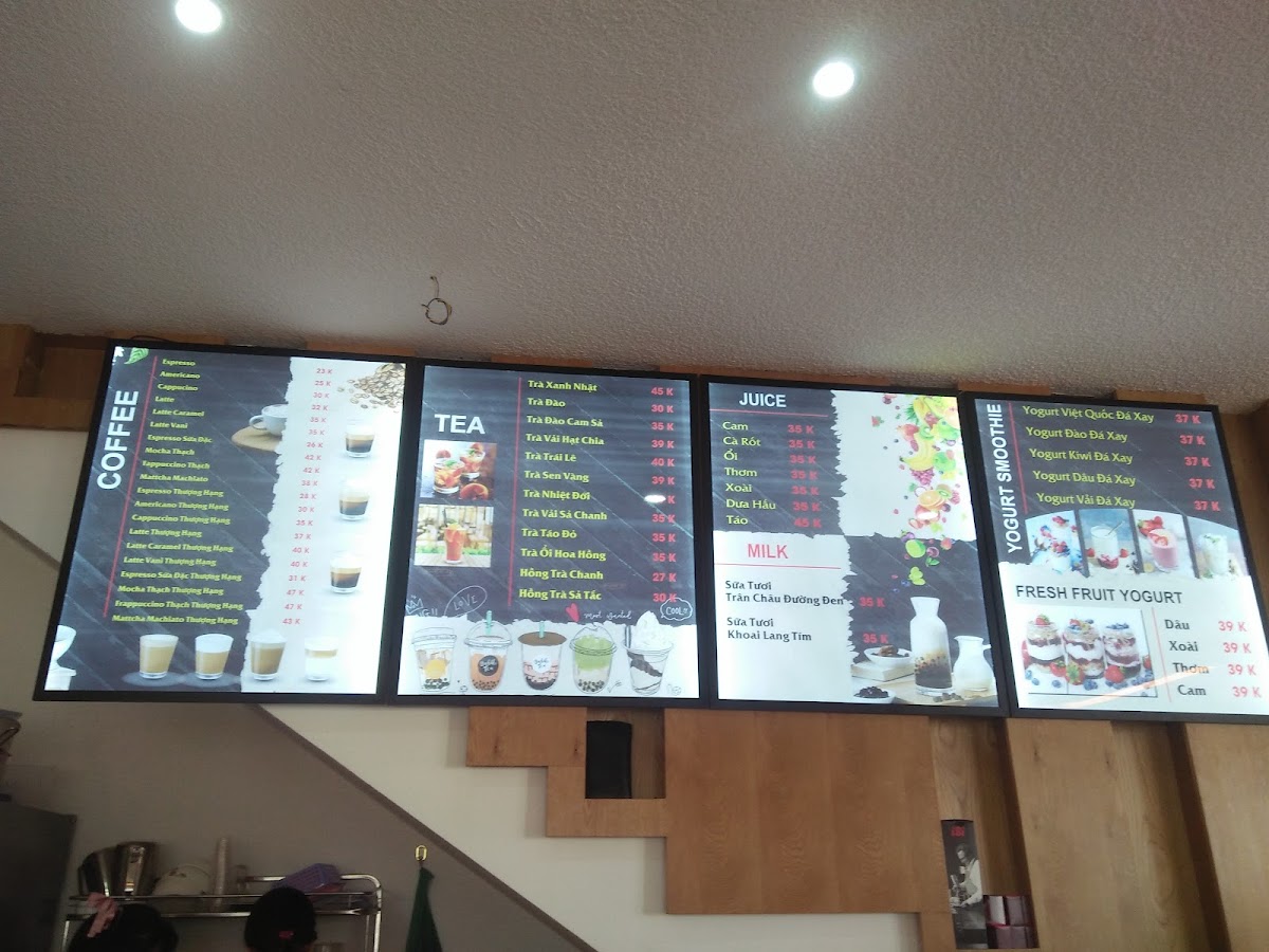 The menu is organized primarily by drink type, featuring categories such as espresso drinks, flavored lattes, milk teas with assorted toppings, and iced blended beverages. These offerings make the menu suitable for coffee breaks, casual meetups, or quick refreshment stops. Light bites or food items are not prominently featured based on available information.
