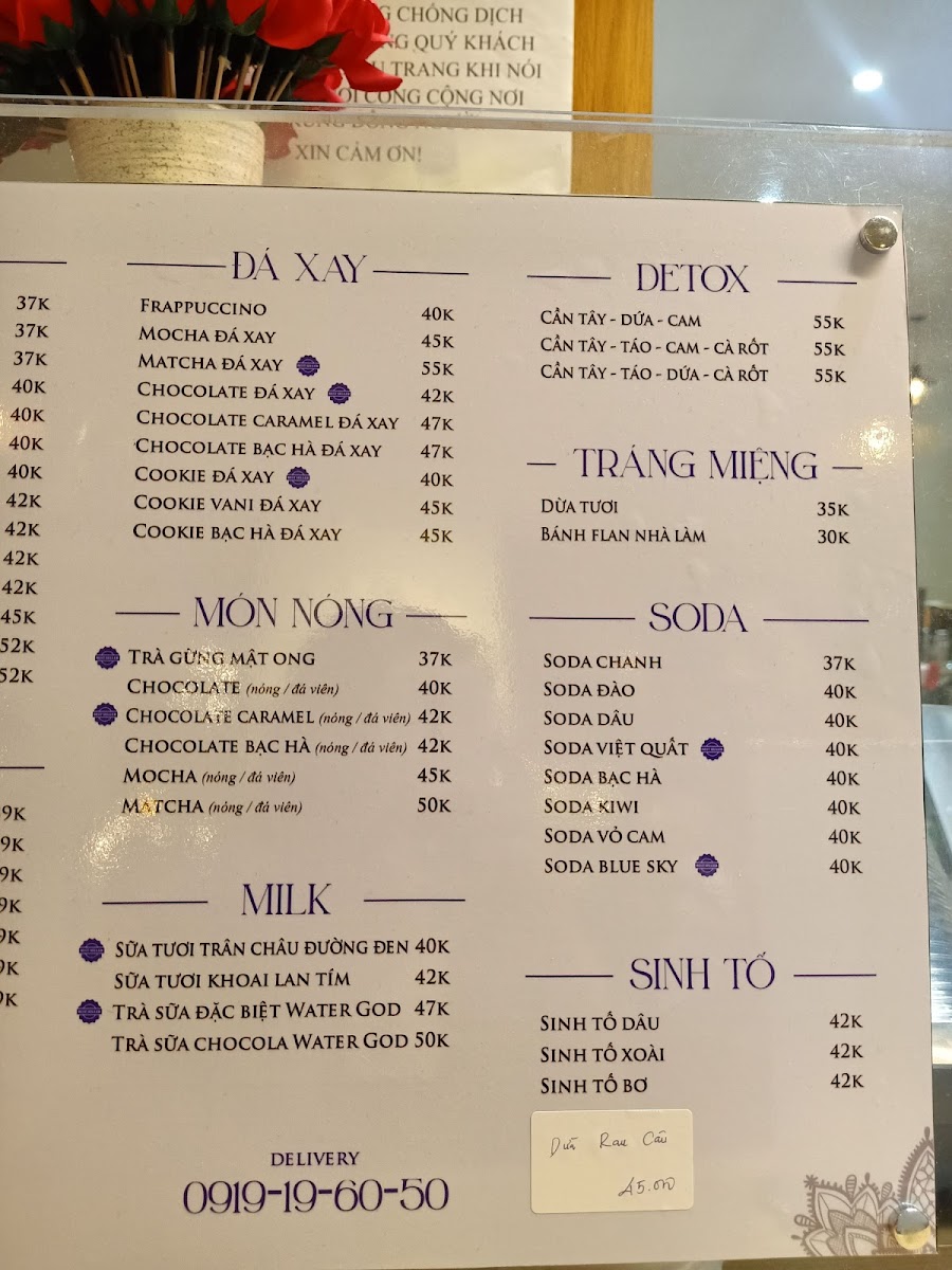 The menu at Water God Coffee & Tea offers a variety of beverages centered around coffee and tea selections. Visitors can expect a range of espresso-based drinks, such as lattes, americanos, and espresso with condensed milk, alongside flavored options like caramel and vanilla lattes. Tea options include fruit teas and milk teas with various toppings. Additionally, there are several blended iced drinks available, catering to customers looking for refreshing choices.